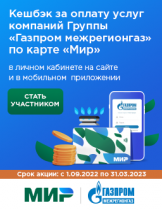 Организатор акции АО «НСПК». Подробная информация об акции размещена на сайте https://privetmir.ru/promo/ghkh/keshbek-za-oplatu-uslug-kompaniy-gruppy-gazprom-mezhregiongaz-kartoy-mir/
